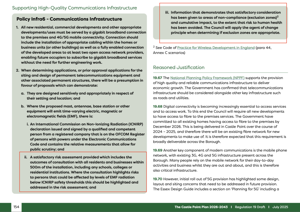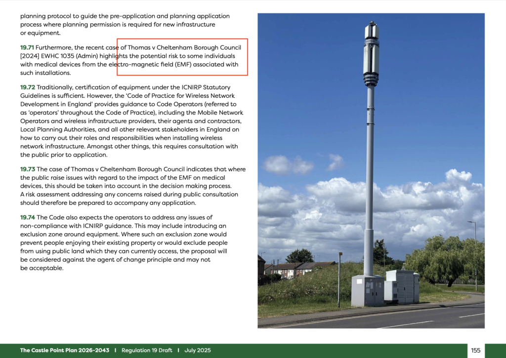 In July 2025, for the first time, a UK Council (Castle Point in Essex) recognised the potential health effects of masts to vulnerable persons and the importance of exclusion zones in its proposed (draft) Local Plan policies. This is a significant crack in the dam to build upon, one that was on the back of Steven Thomas’ High Court success in Cheltenham.